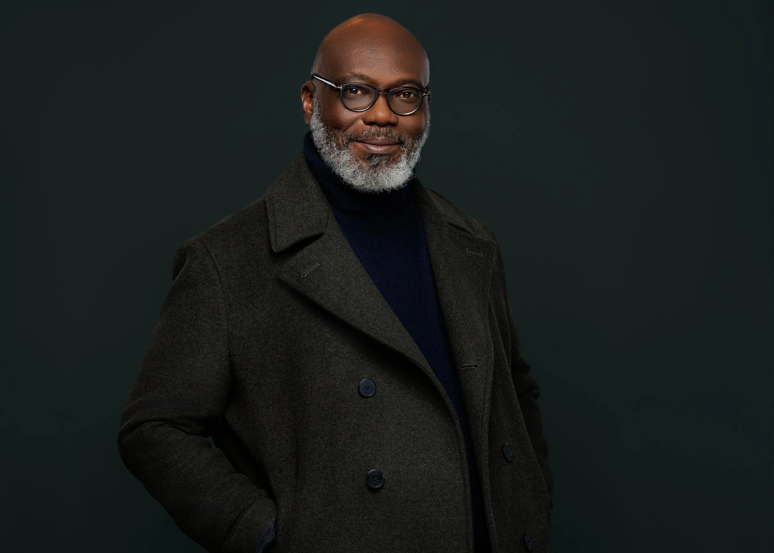 A man in a dark suit with a white shirt, hands clasped, posing against a white background.