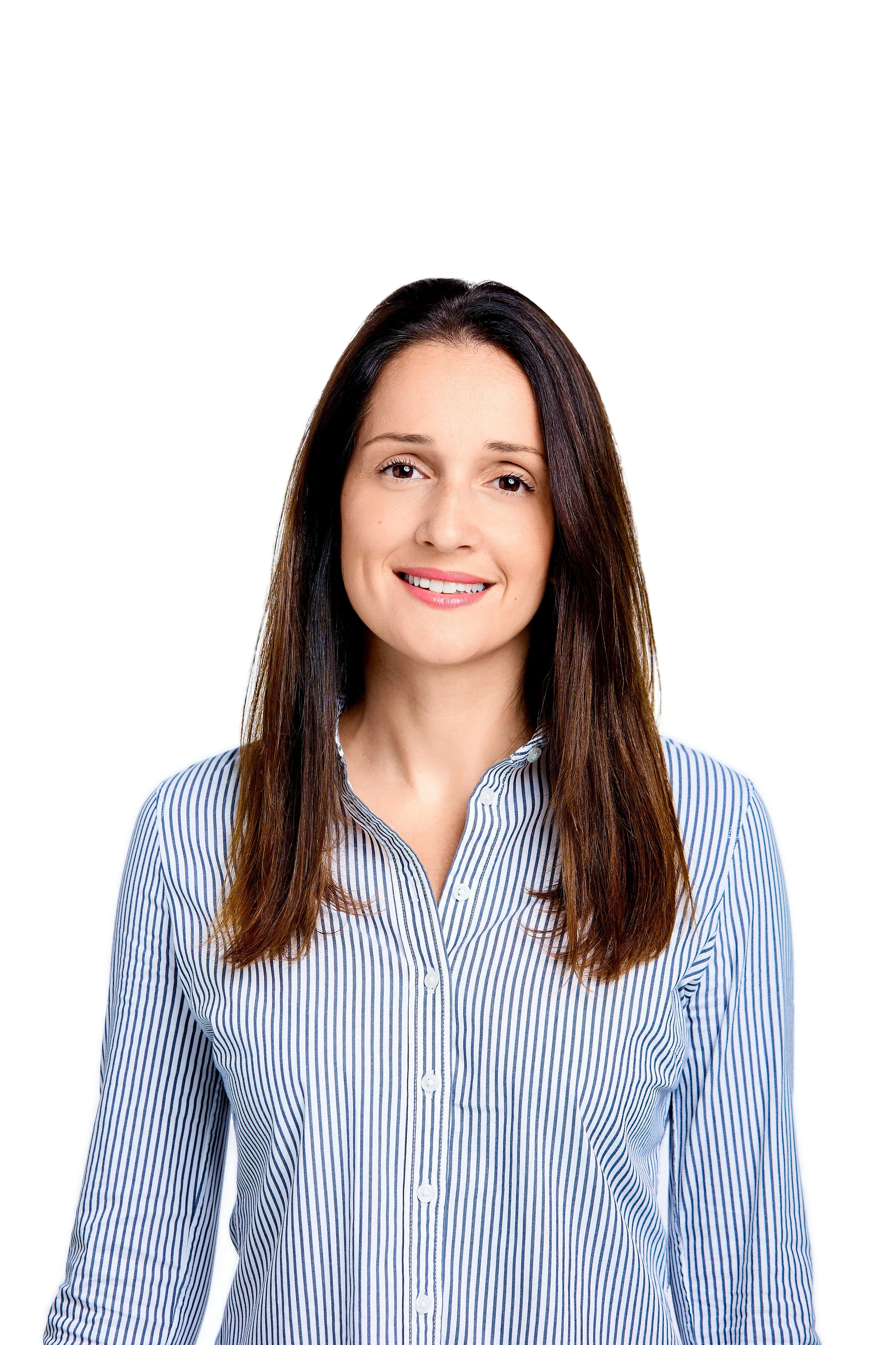 Woman with long black hair sitting at a table in an office, wearing a white blouse and a necklace.