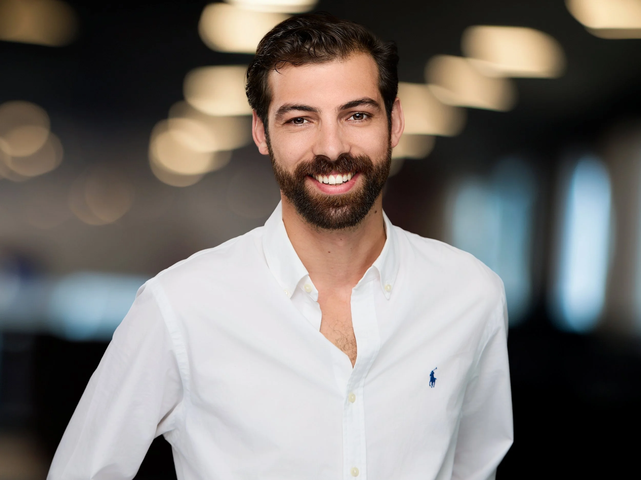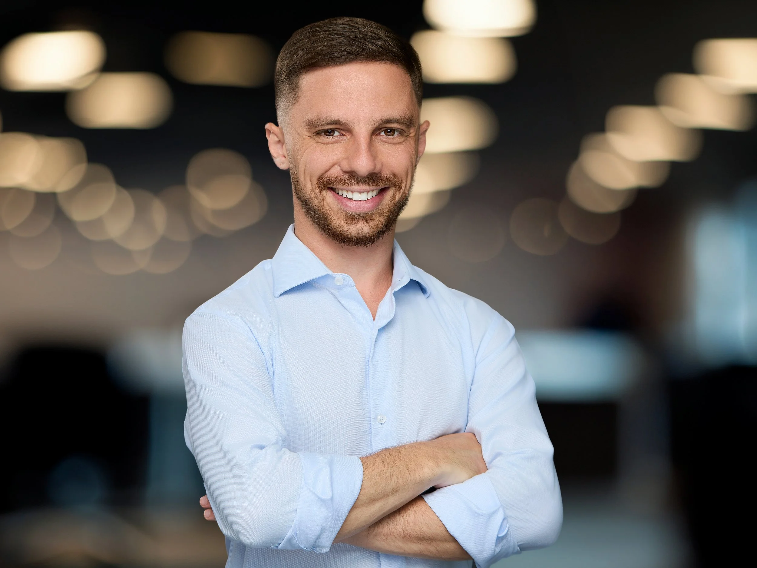 Man in a dark blazer smiling, standing against a plain white background. View fullsize