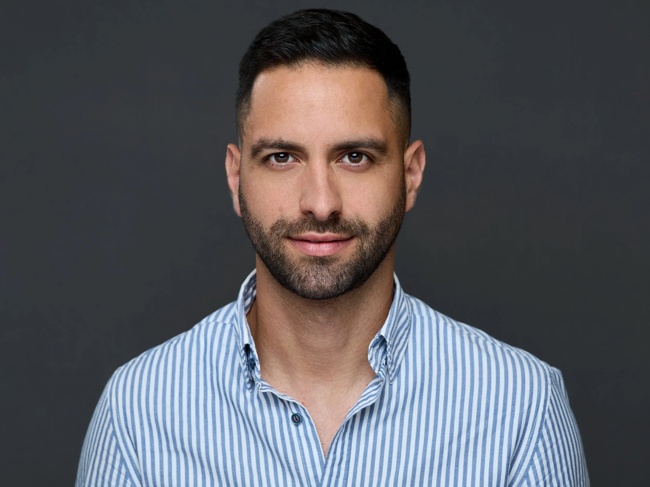Portrait of a man with short dark hair, wearing a dark shirt, against a gray background.