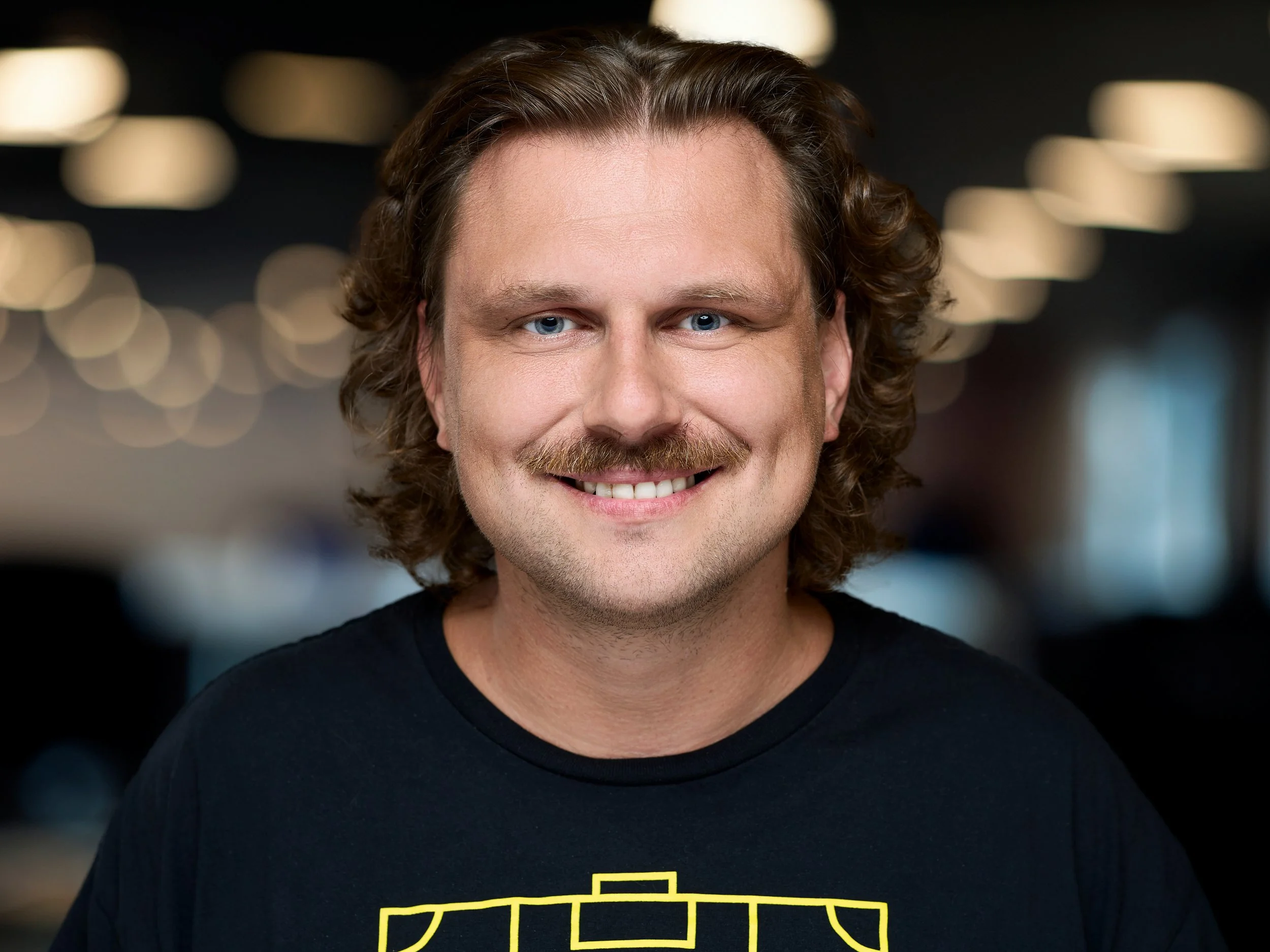 Smiling man with curly hair and mustache wearing a black T-shirt, blurred background.