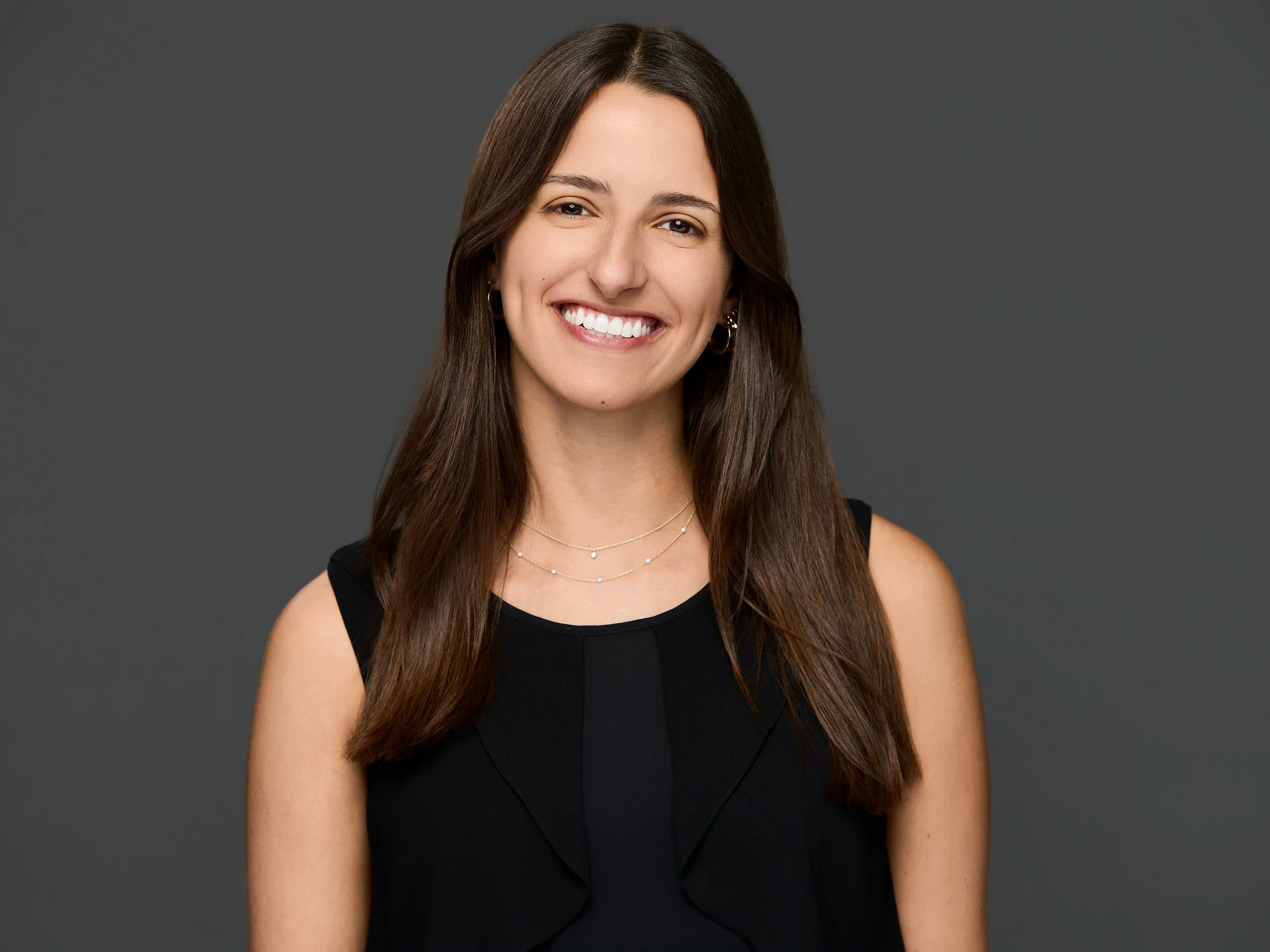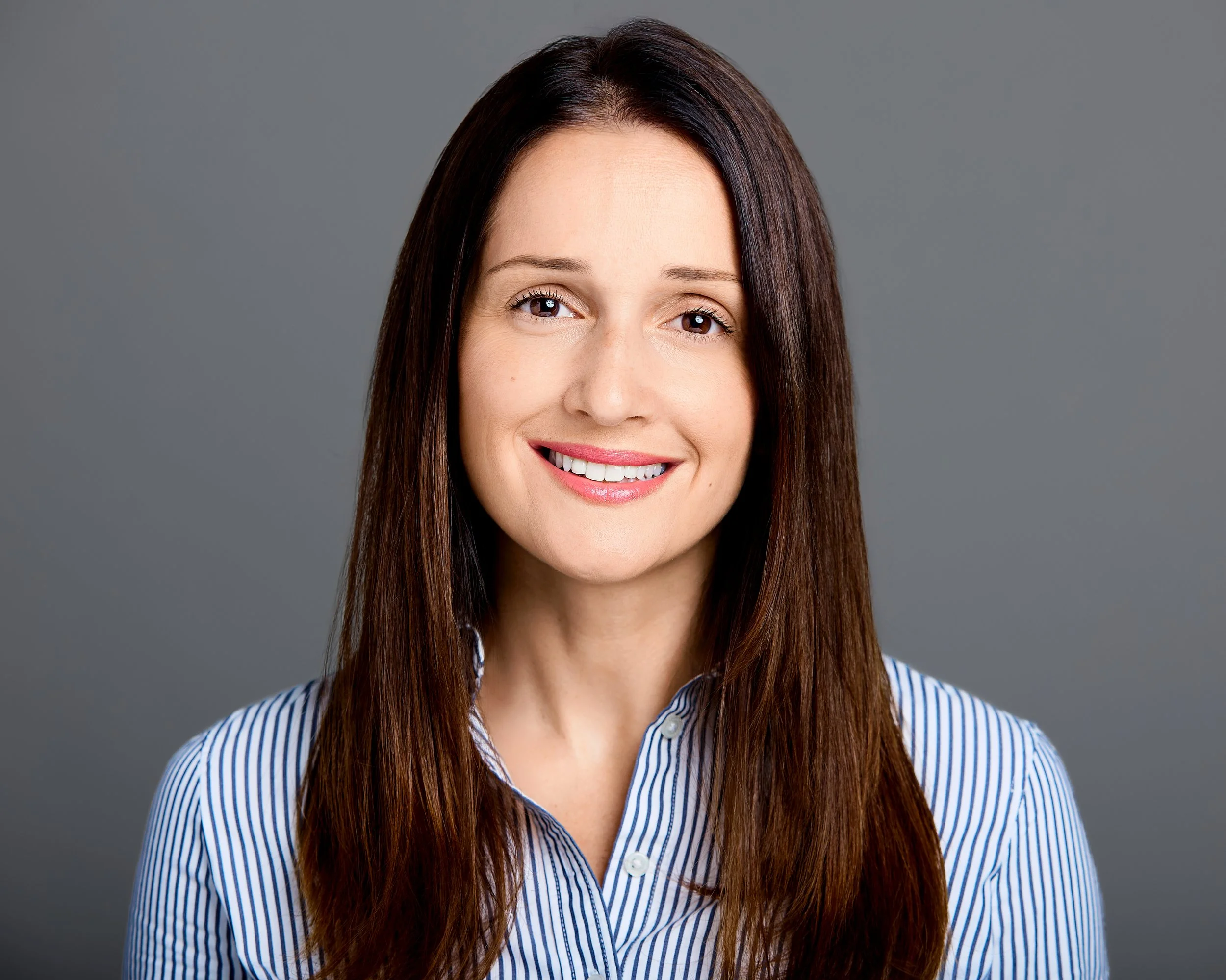 Smiling woman with long brown hair wearing a black sleeveless top against a gray background.