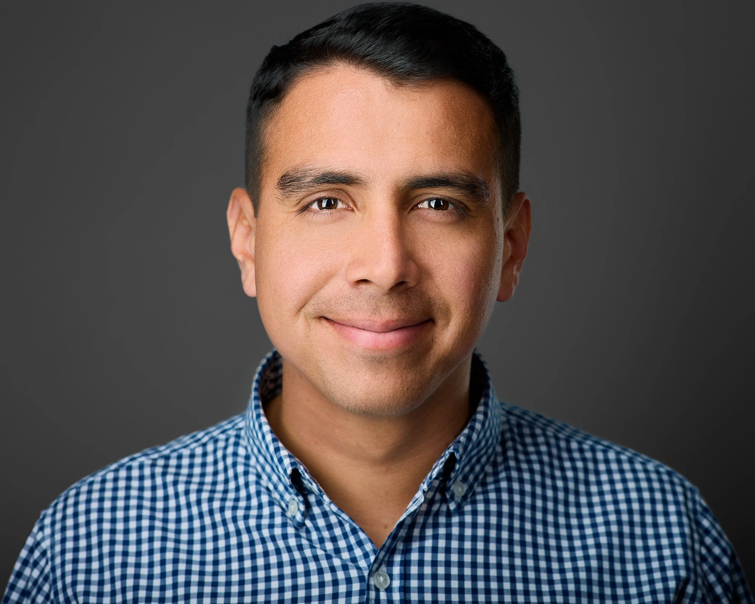 Portrait of a smiling man in a checkered shirt with a gray background.