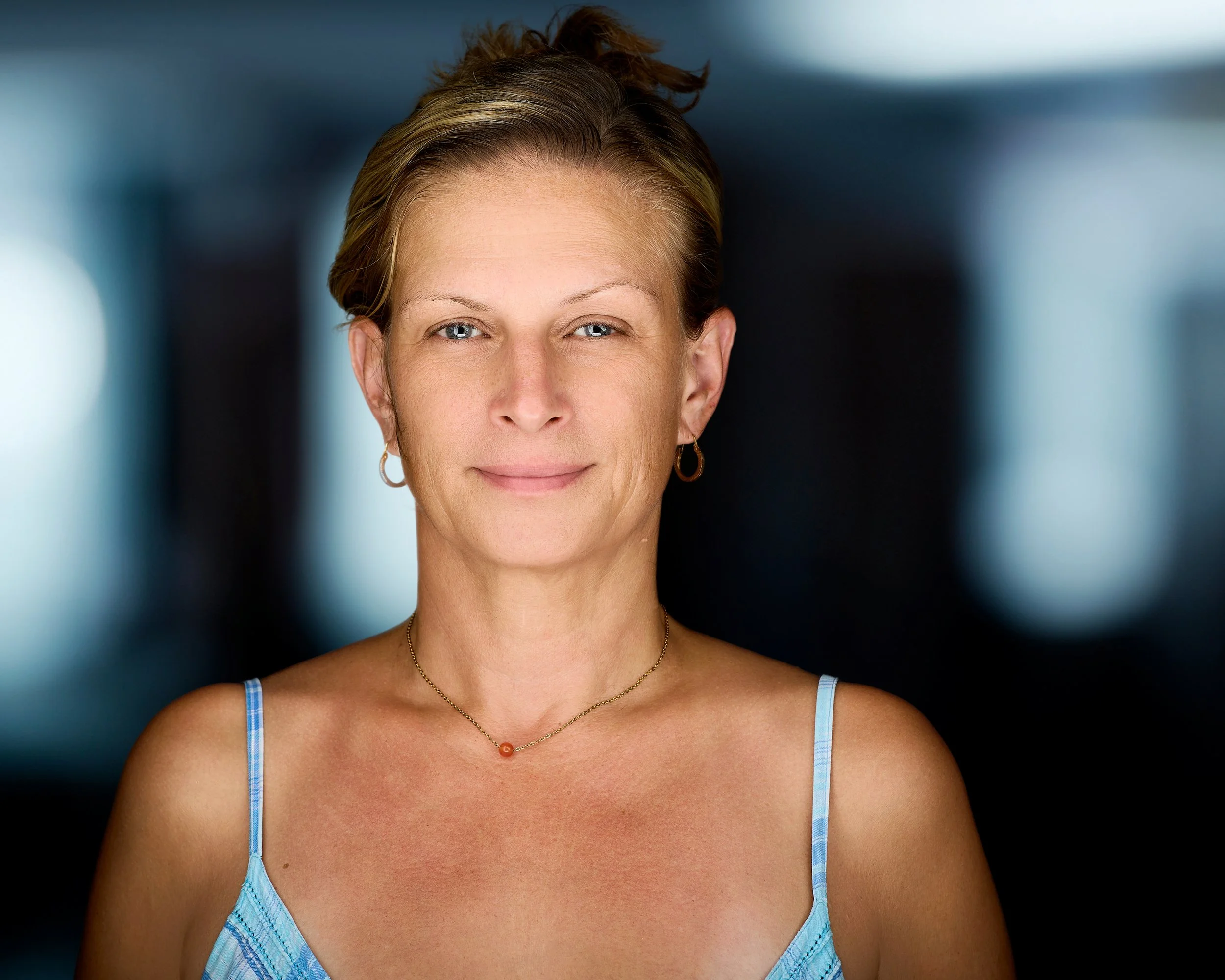 Close-up of a woman with straight brown hair, blue eyes, and a neutral expression against a gray background.