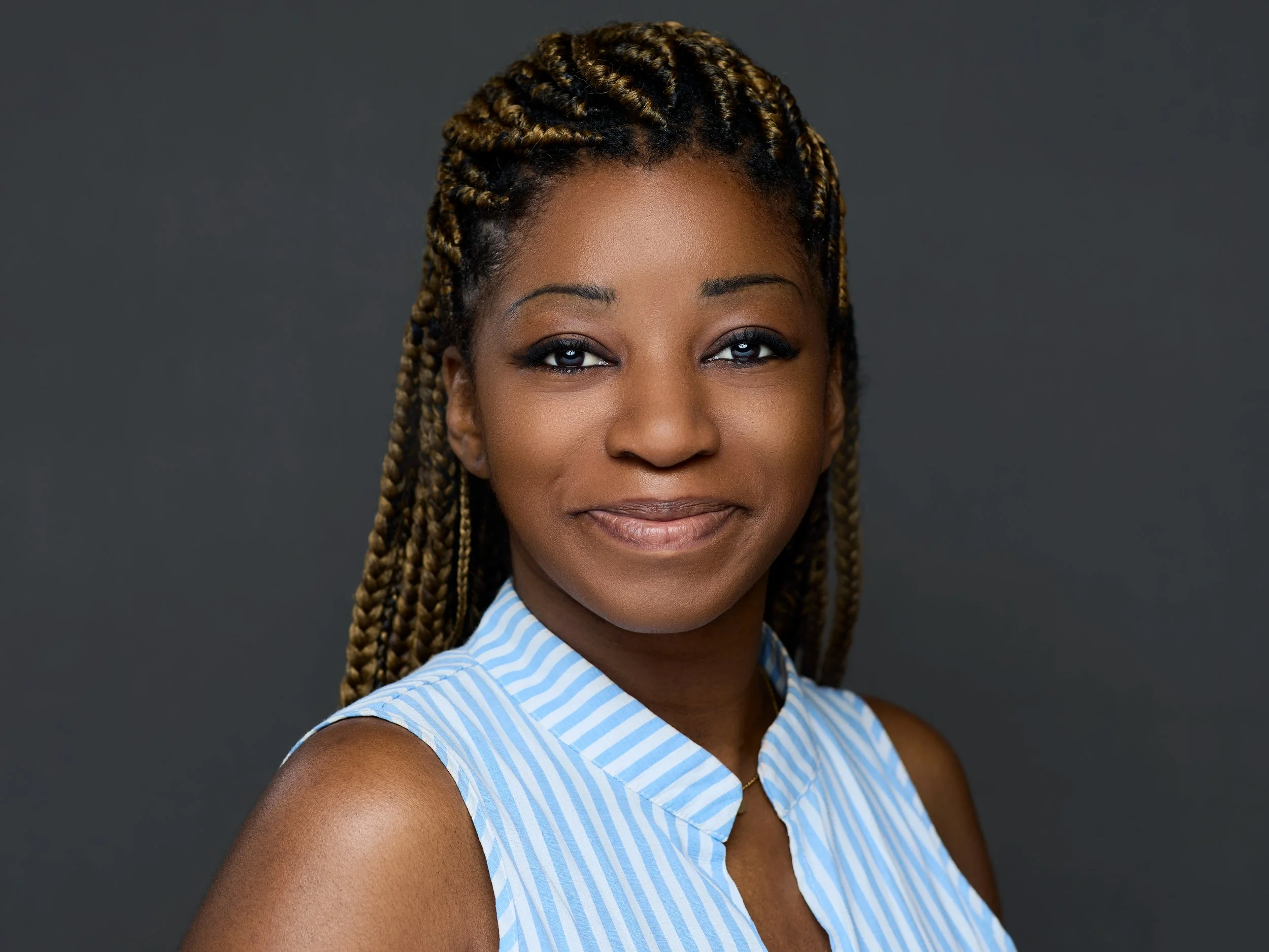 Smiling woman with braided hair and a striped shirt against a dark background.