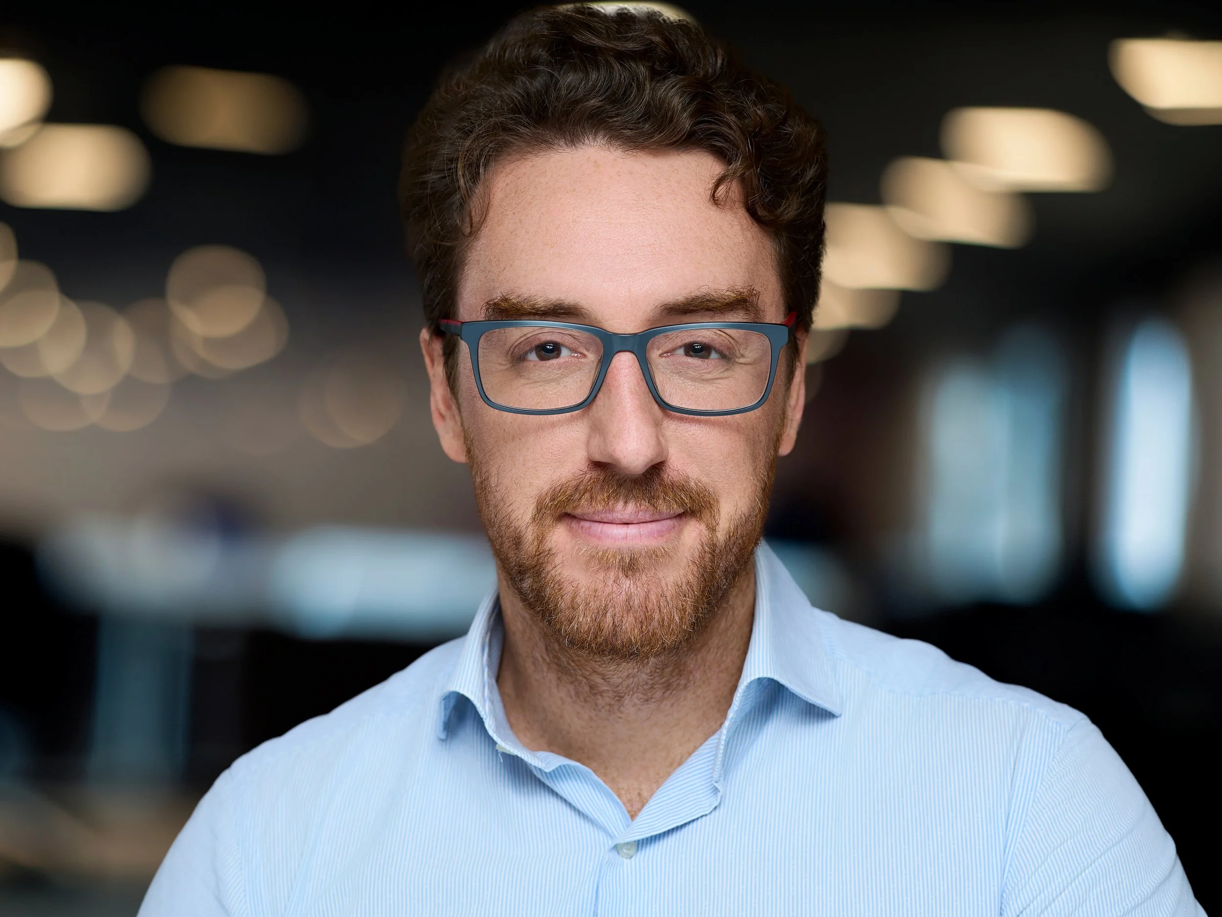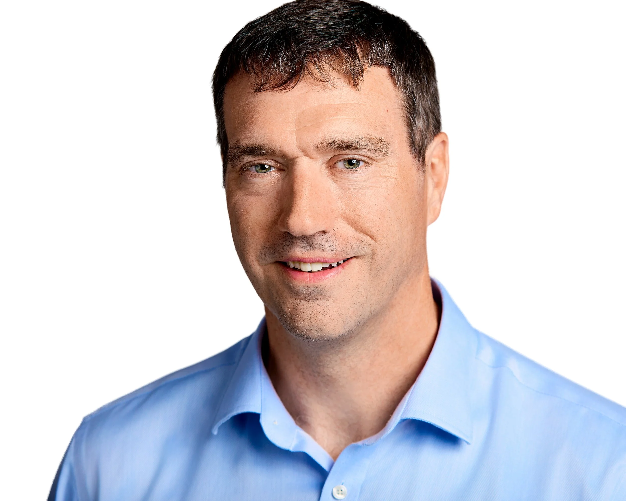 Portrait of a man wearing a light blue button-up shirt against a white background, smiling slightly.