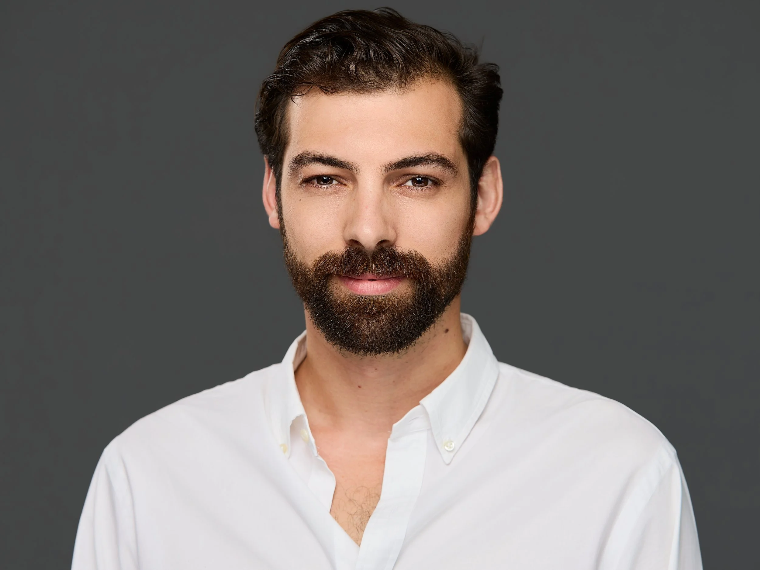 Man with brown hair, beard, wearing a white shirt and dark suit jacket, standing against a white background.