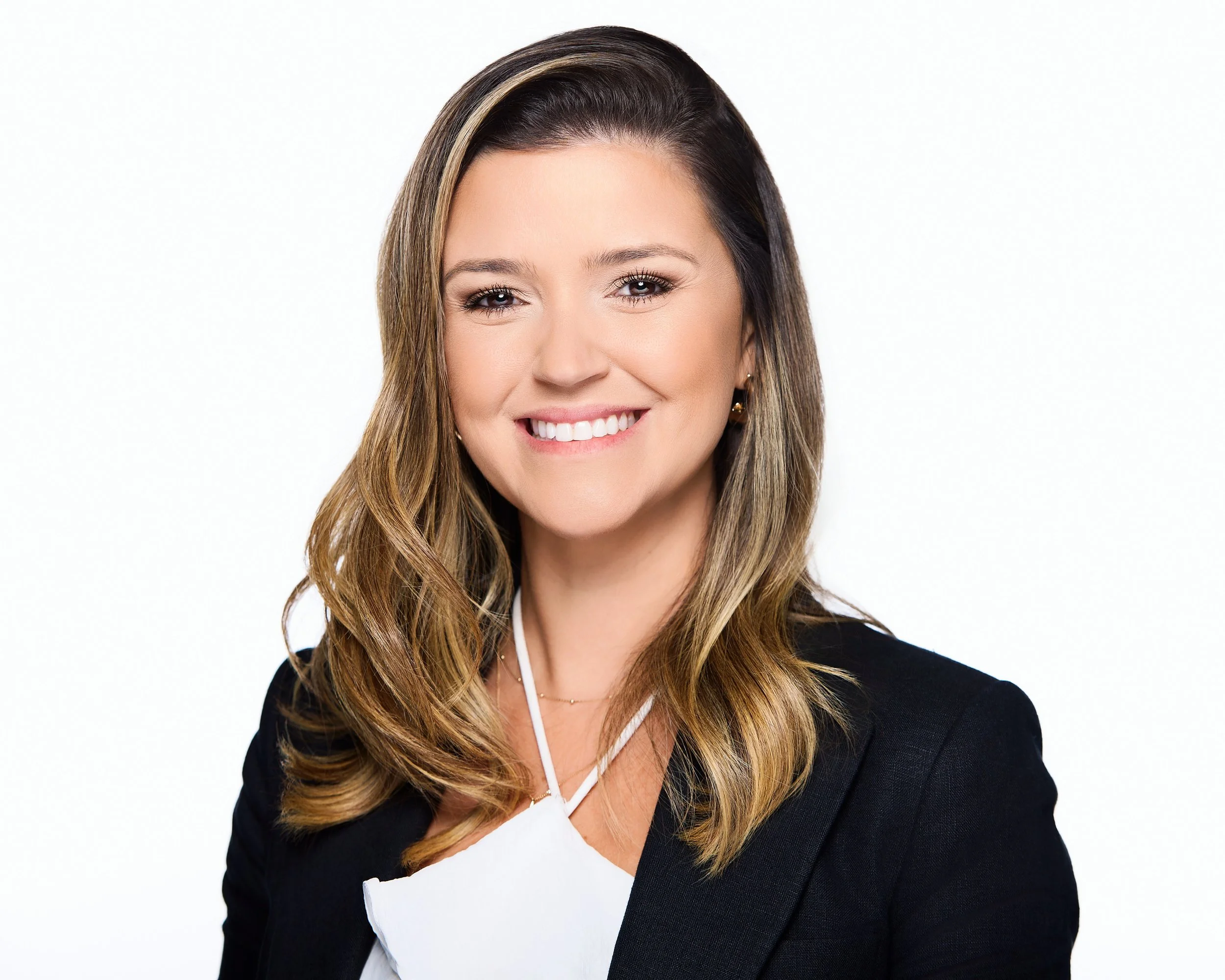 Professional headshot of a smiling woman with light blonde hair, wearing a white collared shirt and black blazer, on a white background.